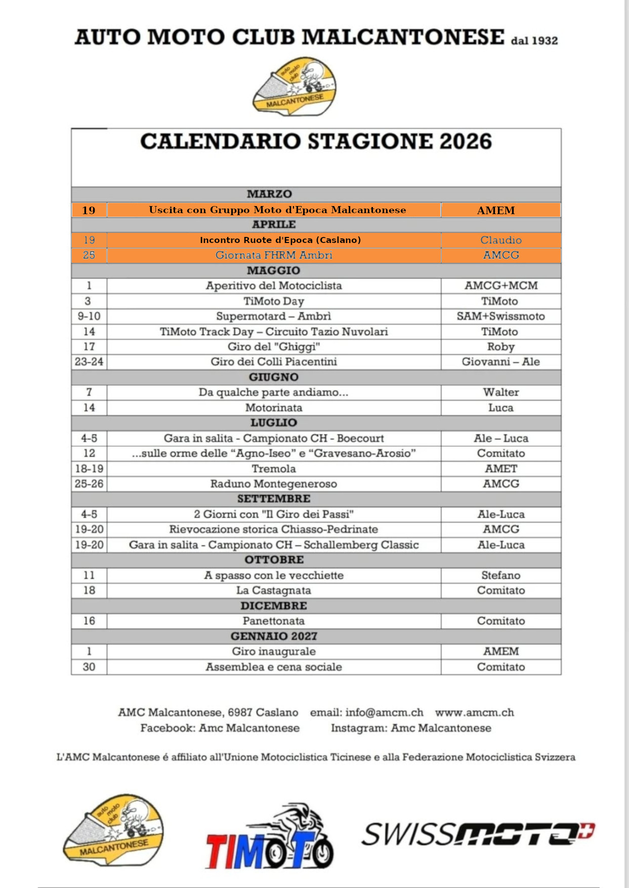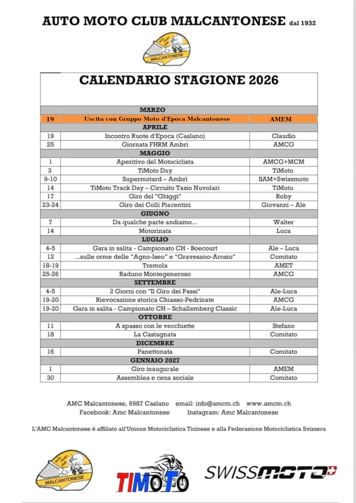 Oltre alla dimensione pratica e ricreativa, il club è anche co‑fondatore della rivista trimestrale TiMoto Giurnal. Un club con oltre 90 anni di storia, guidato nel presente da una squadra appassionata, aperta alla comunità e orientata a costruire esperienze condivise. Situato nel cuore del suggestivo Malcantone, con sede a Caslano, l’Auto Moto Club Malcantonese è un punto di riferimento per tutti gli appassionati di motori della regione e non solo. Fondato con l’intento di creare una comunità unita e appassionata, il club si dedica alla promozione della cultura automobilistica e motociclistica in un contesto conviviale e dinamico. Il club e i suoi soci sono affiliati all’Unione Motociclistica Ticinese UMT (www.timoto.ch) e alla Federazione Motociclistica Svizzera Swissmoto (www.swissmoto.org). Il club è attivo anche sui social come FB e IG, dove vengono condivisi aggiornamenti, foto degli eventi e informazioni utili per tutti i membri e simpatizzanti. Che tu sia un motociclista di lunga data, un appassionato di auto d’epoca, o semplicemente un amante dei motori in cerca di compagnia, l’Auto Moto Club Malcantonese ti accoglie con passione, entusiasmo e spirito di amicizia.